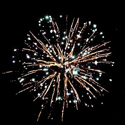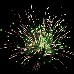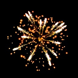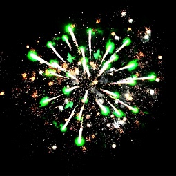 5. Зеленые и фиолетовые кометы в сопровождении хаотично разлетающихся золотых трещащих звезд.